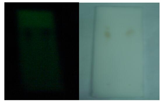樣品配成合適濃度的甲醇液,用點樣毛細管點樣,每點一次要等到干了才能點下次,點樣斑點直徑不大于2mm。層析缸用展開劑飽和20min后,將點樣板垂直放入層析缸,上行展開,展層完畢后,取出,晾干,放在254nm紫外燈下觀察。