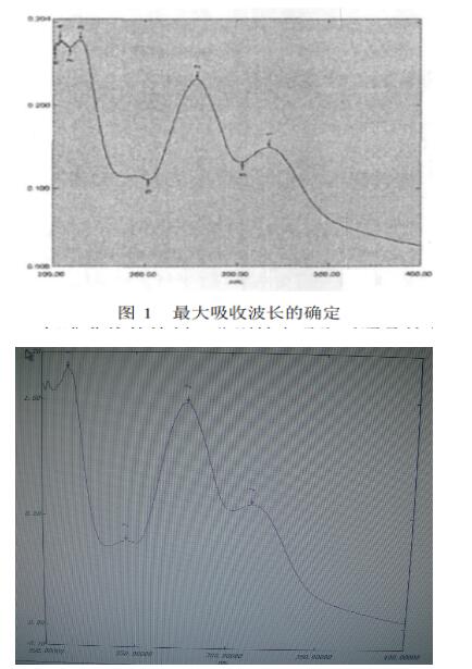 由下圖可知在200-400nm內**大吸收波長為278nm,與文獻中(上圖)的標準品的**大吸收波長一致。