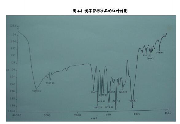 2 紅外圖譜與文獻中標準品的圖譜大部分吻合,不一致的原因可能是:黃芩產地不一樣;本實驗中得到的黃芩苷純度不高。