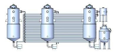 是由三套一效設備構成,第三效蒸發需要的熱量是由二效蒸發出的溶劑提供,第二效蒸發需要的熱量是由一效蒸發出的溶劑提供,大幅減少加熱需要的熱量,節約能耗。