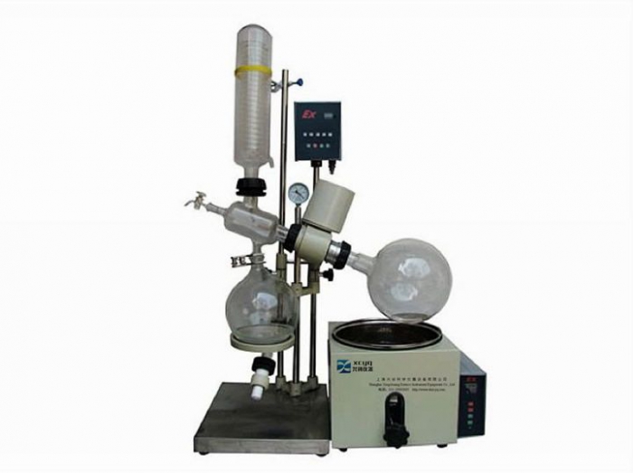 旋轉蒸發器系統可以密封減壓**400~600毫米汞柱;用加熱浴加熱蒸餾瓶中的溶劑,加熱溫度可接近該溶劑的沸點;同時還可進行旋轉,速度為50~160轉/分,使溶劑形成薄膜,增大蒸發面積。旋轉蒸發器里面的蒸餾燒瓶可是一個帶有標準磨口接口(interface)的梨形或圓底燒瓶,這樣通過一高度回流蛇形冷凝管與減壓泵相連,回流冷凝管另一開口與帶有磨口的接收燒瓶相連,用于接收被蒸發的有機溶劑(性狀:透明,無色的液體)。在冷凝管與減壓泵之間有一三通活塞,當體系與大氣相通時,可以將蒸餾燒瓶,接液燒瓶取下,轉移溶劑,當體系與減壓泵相通時,則體系應處于減壓狀態。使用時,應先減壓,再開動電動機轉動蒸餾燒瓶,結束時,應先停機,再通大氣,以防蒸餾燒瓶在轉動中脫落。作為蒸餾的熱源,常配有相應的恒溫水槽。 旋轉蒸發器主要用于醫藥、化工和生物制藥等各種行業的濃縮、結晶、干燥、分離及溶煤回收。其原理為:在真空條件下,恒溫加熱,使旋轉瓶恒速旋轉,物料在瓶壁形成大面積薄膜(薄而軟的透明薄片),高效蒸發。溶煤蒸氣經高效玻璃材質冷凝器(類別:換熱設備)冷卻(cooling),回收于收集瓶中,大大提高蒸發效率,特別選用于對高溫容易分解變性的生物制品的濃縮提純。旋轉蒸發器的重要技術是系統(system)的氣密性,即在各種溶劑的侵蝕下,在運動狀態下,系統能否保持高真空度。