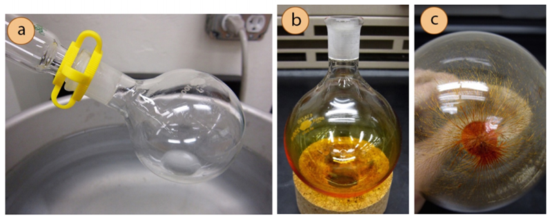 將燒瓶降低到水浴中以浸沒液體(不要浸入塑料夾)。