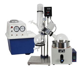旋轉(zhuǎn)蒸發(fā)器或“ 旋轉(zhuǎn)蒸發(fā)器 ” 的主要組件包括電機(jī)單元,蒸氣管道,真空系統(tǒng),加熱的液浴,帶有使冷卻劑通過(guò)的盤(pán)管的冷凝器或“冷指”,冷凝水收集瓶和機(jī)械或電動(dòng)機(jī)構(gòu)。在旋轉(zhuǎn)蒸發(fā)儀中,電動(dòng)機(jī)旋轉(zhuǎn)裝有用戶(hù)樣品的蒸發(fā)瓶或小瓶。蒸氣導(dǎo)管是樣品旋轉(zhuǎn)的軸,并且是用于將蒸氣從樣品中抽出的真空密封導(dǎo)管。真空系統(tǒng)大大降低了蒸發(fā)器系統(tǒng)內(nèi)的壓力。真空系統(tǒng)可以像帶浸入冷水槽中的疏水閥的抽水機(jī)一樣簡(jiǎn)單(用于無(wú)毒溶劑),也可以像帶冷凍疏水閥的可調(diào)節(jié)機(jī)械真空泵一樣復(fù)雜。通常為水的加熱液浴加熱樣品。旋轉(zhuǎn)蒸發(fā)器中使用的冷凝器可以是簡(jiǎn)單的,也可以是復(fù)雜的,具體取決于蒸發(fā)的目標(biāo)以及溶解的化合物可能給混合物帶來(lái)的任何傾向。冷凝液收集瓶位于冷凝器的底部,在重新冷凝后捕獲蒸餾溶劑。